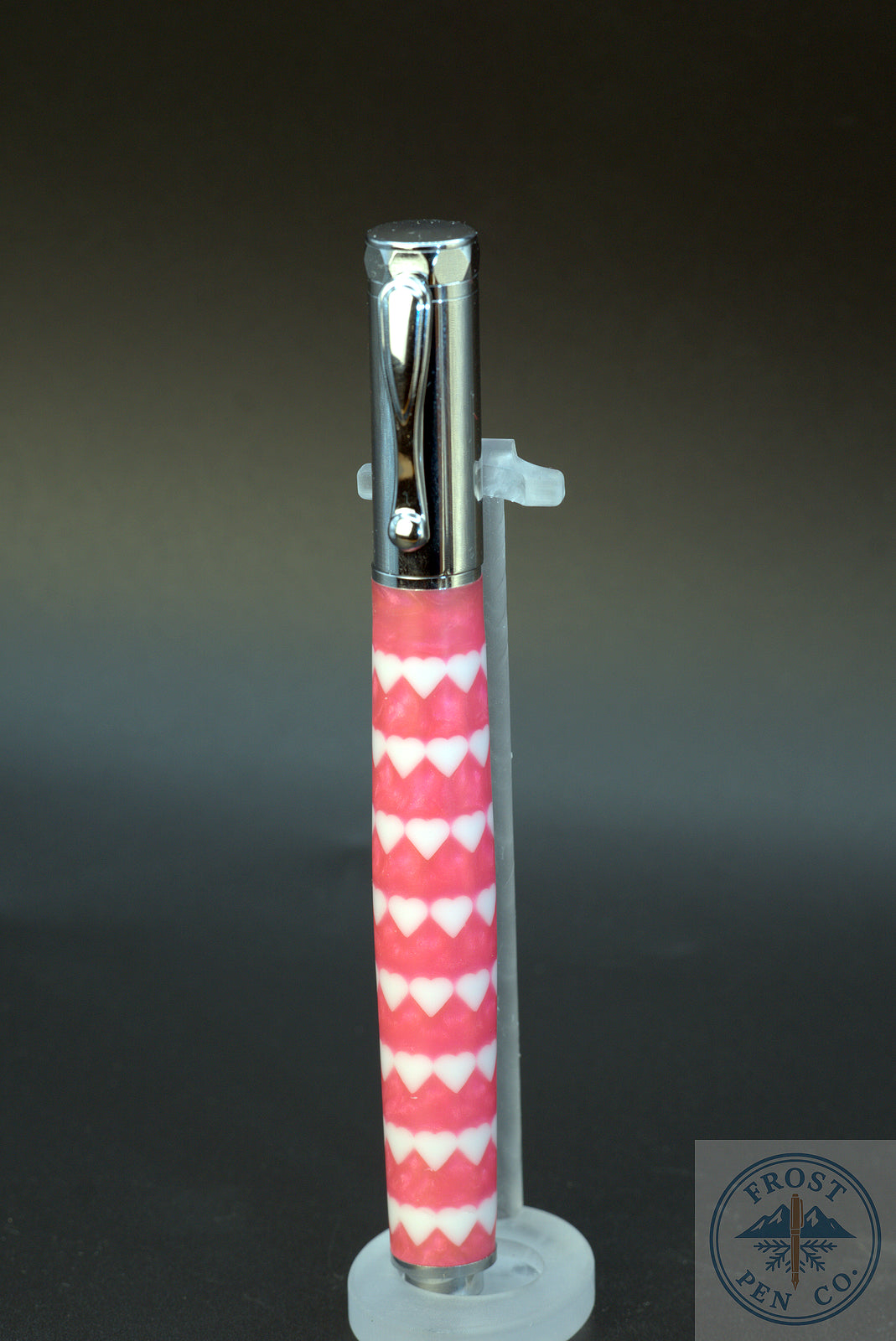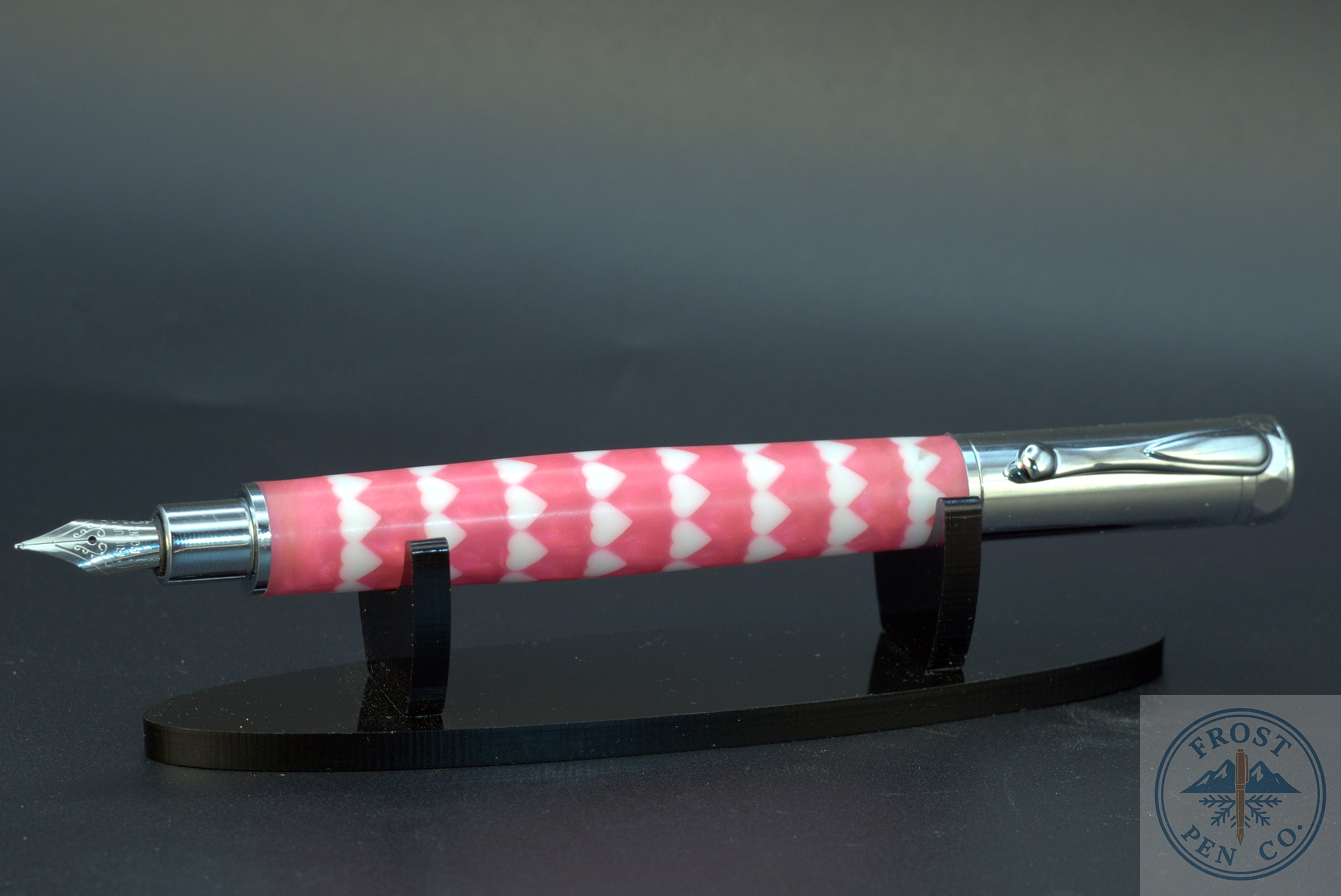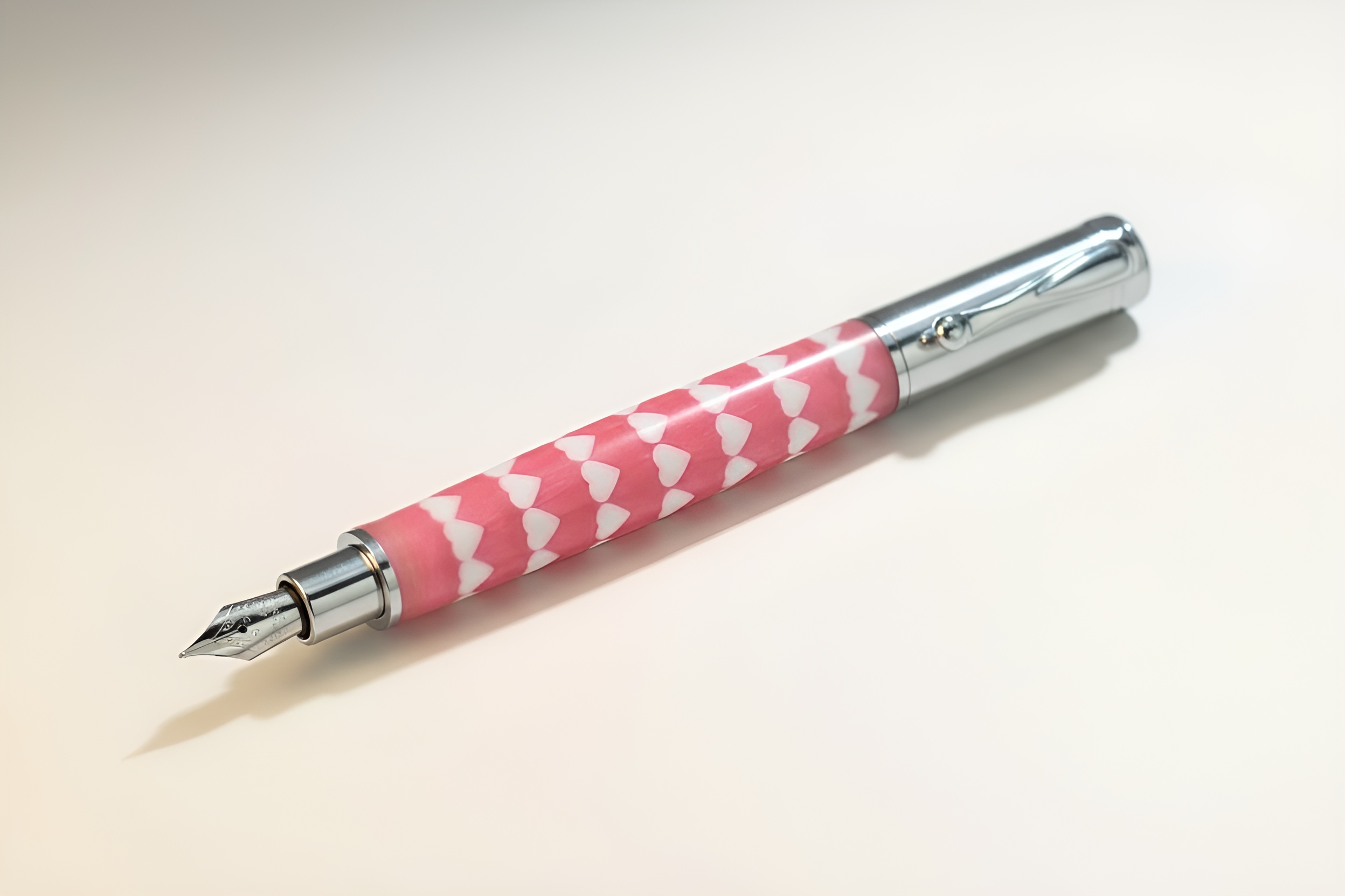 The Solace Fountain Pen was designed to bring ease, balance, and quiet joy to everyday writing. For this Valentine’s Day edition, that spirit is wrapped in a warm, expressive palette: soft Valentine Pink resin, accented with crisp white hearts suspended throughout the material.